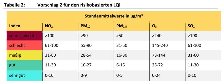Der Vorschlag 2 für einen LQI berücksichtigt das Erkrankungsrisiko durch verschiedene Luftschadstoffe. Die grundlegende Idee dieses LQI ist, dass das Risiko für die selektierten gesundheitlichen Auswirkungen in jeder Bewertungsklasse unabhängig vom jeweiligen Schadstoff gleich ist. Die Bewertungsklassen sind somit risikoäquivalent. Dieser risikobasierte Index basiert auf linearen Expositions-Wirkungsbeziehungen zur kurzfristigen Wirkung von Luftschadstoffen im Hinblick auf verschiedene Gesundheitsendpunkte.