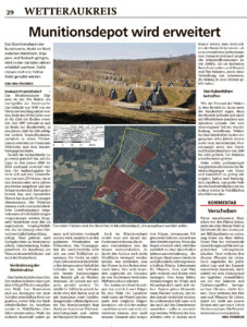 Wehrheim – In der vergangenen politischen Sitzungsrunde teilte Bürgermeister Gregor Sommer (CDU) mit, dass es in der kommenden Zeit Umbauarbeiten am Munitionsdepot Köppern geben werde. Die Bundeswehr habe sich aber nicht genauer dazu geäußert, welche genauen Umbauten geplant seien und warum diese überhaupt stattfänden. Die Verwaltung habe dazu eine Information vom Landesbetrieb Bau und Immobilien Hessen (LBIH) bekommen.[…]