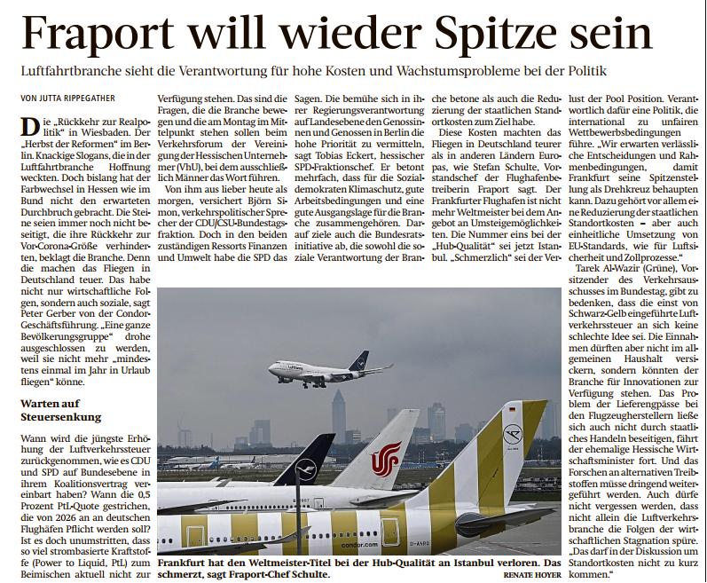 In der heutigen Ausgabe der Frankfurter Rundschau lesen wir unter der Überschrift „Fraport will wieder Spitze sein“ den Untertitel: „Luftfahrtbranche sieht die Verantwortung für hohe Kosten und Wachstumsprobleme bei der Politik.“